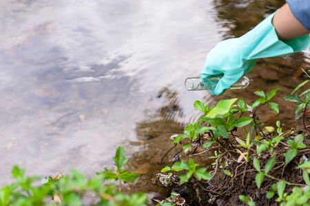 A water sample from the river. Hand in glove collects water in a test tube. ecology concept
