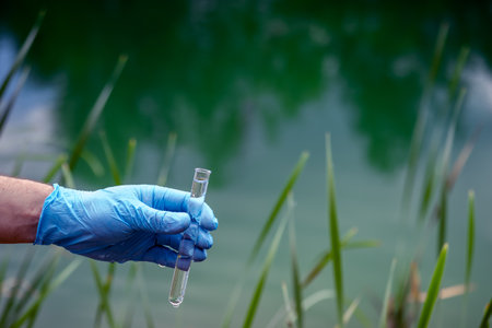 Environmental scientist collecting river water sample with blue gloved hand and test tube close up