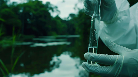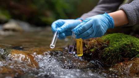 A dedicated environmental scientist is collecting water samples in a natural setting, highlighting the importance of ecological research and analysis.