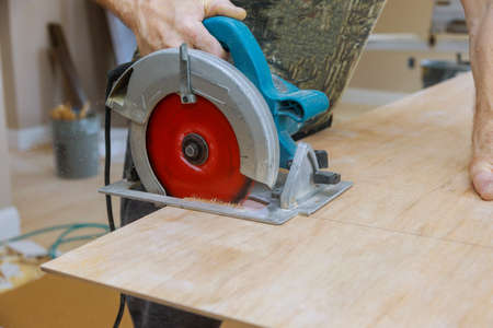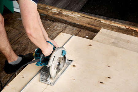 Sawing plywood by circular saw. Home repair. Hand tool. Man hold equipment. Building process. Woodworking. Safety engineering. Without gloves. Copy space. Indoor. Cutting material. Rental instrument.