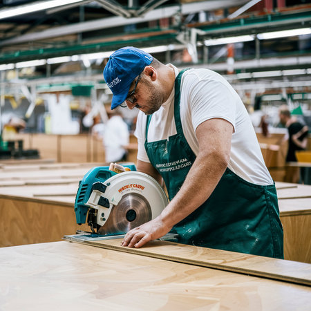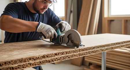 A focused carpenter, wearing safety gloves and glasses, uses a circular saw to precisely cut a sheet of lightweight engineered material with a visible corrugated core. The scene is set in a construction or workshop environment, highlighting modern building materials and skilled labor.