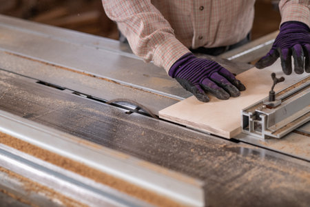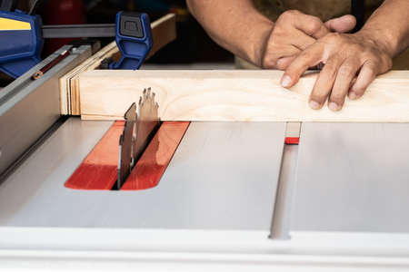 carpenter saws wood on a tabelsaw in workshop ,woodworking concept. selective focus