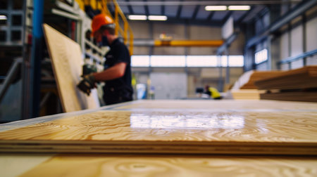 Close-up of stacks of plywood sheets in industrial setting, wood at manufacture factory. Stockwood treating in production woodwork plant. Woodwork plywood industry concept. Copy ad text space