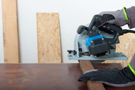 Carpenter cuts wood lath electric hand tool circular saw on desk, on background oriented strand board
