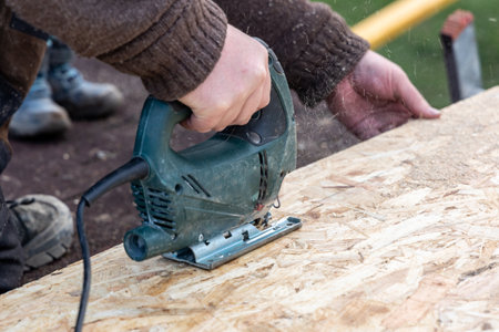 Man cuts wood products, using electric jigsaws outdoors. Close-up
