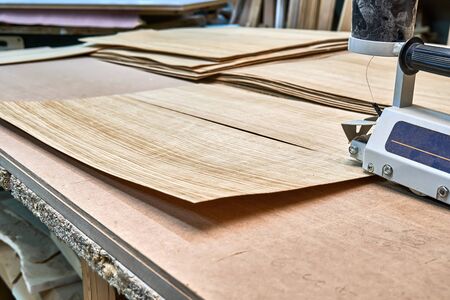 Oak veneer. Oak texture. Veneer splicing process with veneer hand splicer in woodshop. Close-up