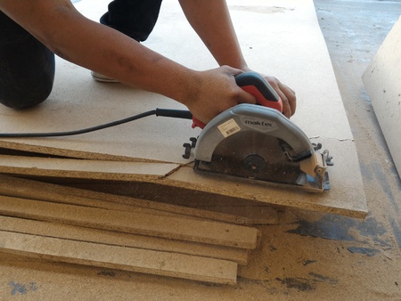smooth movements with the saw along the marked cutting line on the chipboard.