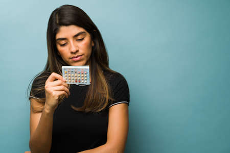 Gynecology concept. Healthy woman holding a blister of contraceptive pills. Young woman taking birth control pills