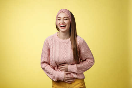 Amused and entertained charming young european female student laughing till belly hurts from giggle smiling holding palms on stomach, having fun enjoying watching funny comedy over yellow wall