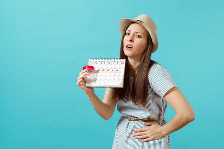 Portrait of sad woman in dress holding white bottle with pills, female periods calendar, checking menstruation days isolated on blue background. Medical healthcare, gynecological concept. Copy space