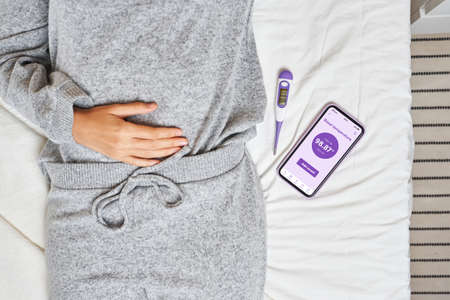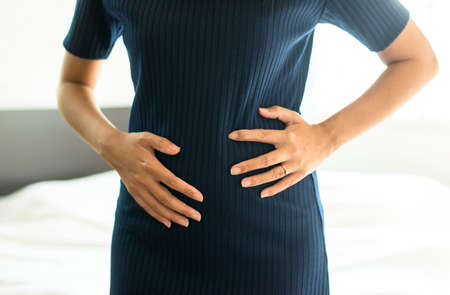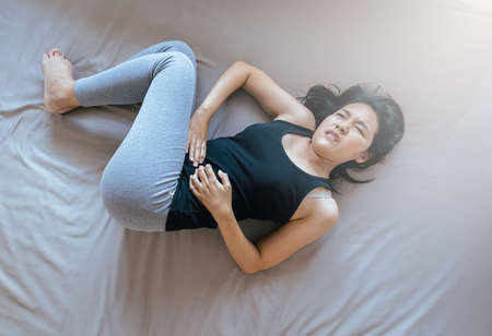 Woman having painful stomachache,Female suffering from abdominal pain,Top view
