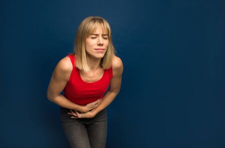 Woman holding her stomach suffering from an abdominal ache isolated over background