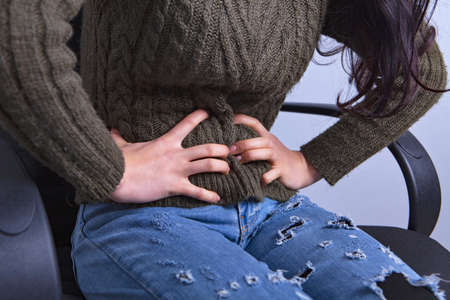 Stressed young woman suffers from abdominal pain. An unhappy 20-year-old girl with painful menstrual sensations. The concept of gastritis, abdominal pain or menstruation.