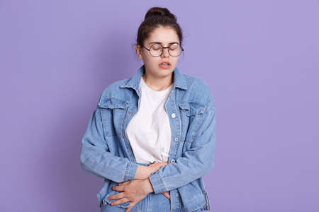 Woman with stomach pain posing isolated over lilac background, keeps eyes closed, suffering from pain in belly, looks sad, wearing denim jacket and white shirt.