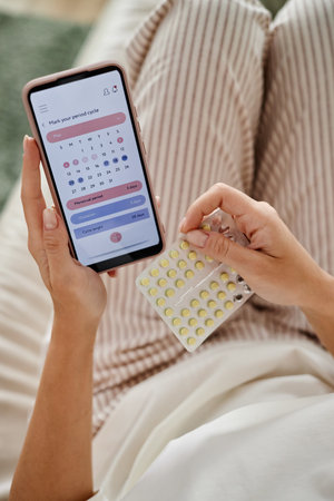 Young adult woman holding smartphone displaying period tracking app while holding blister pack of birth control pills, sitting with striped pants visible in background