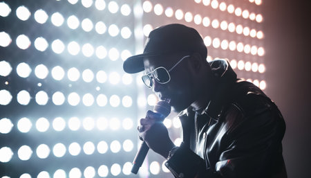 African rapper on stage rap, dynamic pose, hero angle, AI generative illustration
