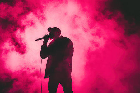 Shadowy figure of a singer wearing a hat and performing live, evoking musical passion and artistic stage presence.