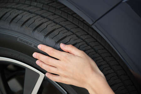 Female driver hands inspecting wheel tire of her new car. Vehicle safety concept