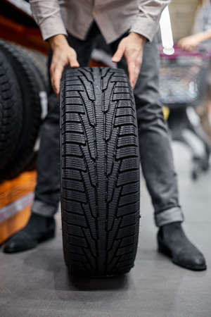 A person hand checking holding car wheels abstract transportation industrial background. Dealership auto service, repairing point, producer station