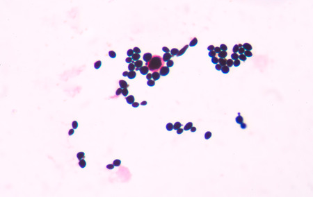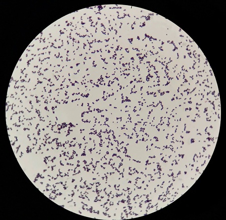 Smear of Gram's stained with gram positive cocci bacteria, under 100X light microscope.