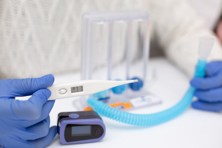 Doctor examining human respiratory model with clock and notes in a clinical setting