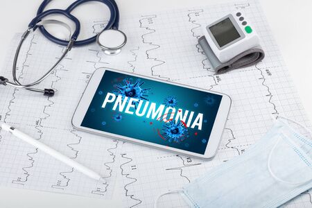 Tablet pc and doctor tools on white surface with PNEUMONIA inscription, pandemic concept