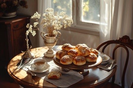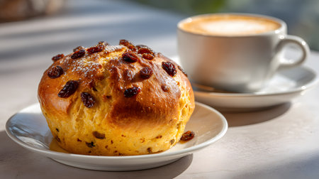 A golden brown currant bun with raisins served on a white plate, accompanied by a cup of coffee on a softly lit breakfast table, capturing the warmth and inviting atmosphere of a cozy morning.
