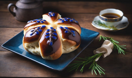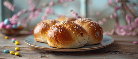 Close-up shot of Tsoureki, Traditional Greek Easter bread, beautifully presented on a table adorned with olive branches and spring flowers