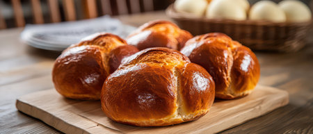 Golden brown rolls are arranged on a wooden board with a rustic setting showcasing the warmth of homemade baking in a cozy kitchen.