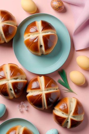 Homemade fresh Easter hot cross buns for easter breakfast on a pastel pink background. Top view. Easter baking, traditional English cuisine.