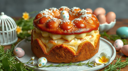 Delicious spring-inspired cake adorned with pastel eggs and flowers, perfect for festive celebrations and gatherings