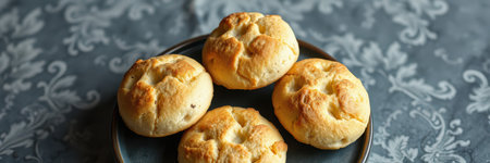 Warm, golden-brown bread rolls are presented on a simple stoneware plate. The cozy atmosphere features a textured gray backdrop, perfect for a comforting meal.