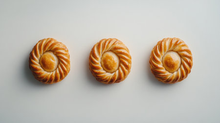 A minimalist shot featuring three golden brown empanadas arranged neatly, showcasing their intricate braid design and inviting texture. Perfect for food-related projects.