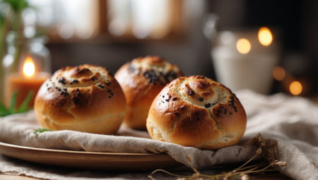 Freshly baked bread rolls served on a decorative plate during a cozy meal setting