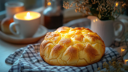 Melon pan (sweet Japanese bread) with crackly cookie crust, slightly warm, placed on a checkered cafe napkin, cozy bakery lighting.