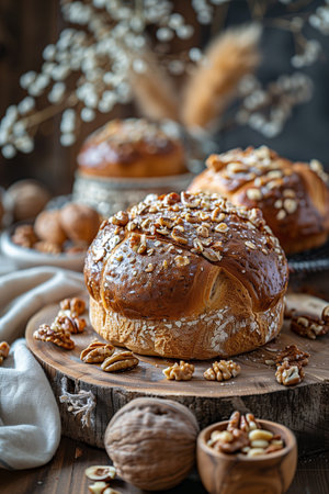 Freshly baked bread topped with nuts, beautifully arranged on wooden platter, surrounded by walnuts and soft cloth. warm tones and textures create cozy, inviting atmosphere.