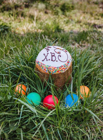 painted and decorative Easter cake and eggs in the grass. Top view, copy space