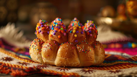 A colorful pastry with sprinkles on top sits on a tablecloth. Concept of festivity and celebration