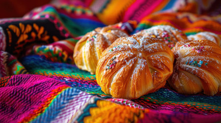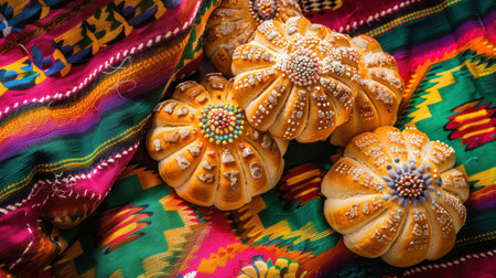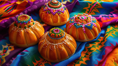 Three round pastries with colorful decorations on top sit on a colorful cloth. The cloth is patterned with various colors and designs, giving the scene a festive and inviting atmosphere