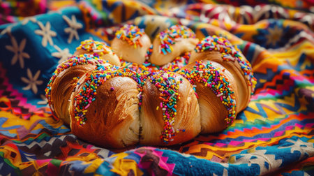 A colorful pastry with sprinkles on top sits on a colorful blanket. The pastry is decorated with a variety of colorful sprinkles, making it look festive and inviting