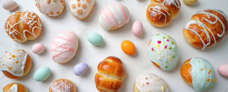 a variety of easter buns with decorative eggs and icing.