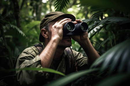 shot of a man looking through binoculars while in the jungle, created with generative ai