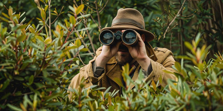 The picture of the bird watcher that has been searching for the birds with the binocular in the forest, the bird watcher require patience, knowledge of bird habits and the ethical awareness. AIG43.