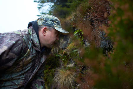 Hunter with shotgun gun on hunt. Man holding shotgun. Clothes for the hunter. Small game.