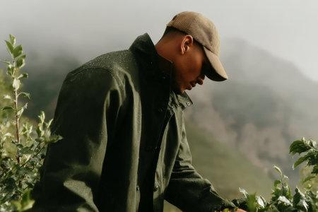 Young african male in cap and raincoat exploring misty mountain landscape.