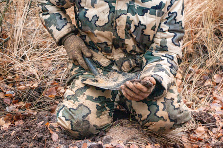 A man in camouflage inspects a device in the forest during early morning light while surrounded by lush greenery and tall trees
