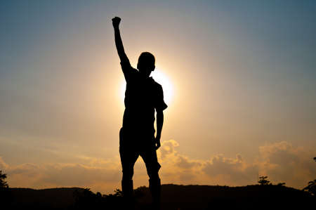 silhouette of man show arm up for achievements successful and celebrating success with sunrise