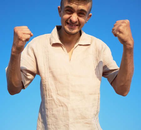 Happy young man with both arms up over a blue sky