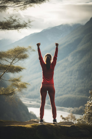 Elated woman in red celebrating atop mountain overlooking valley