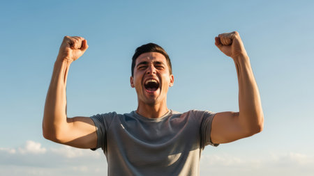 Young male celebrating success outdoors with joyful expression.